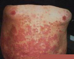一、急性湿疹:发病较为迅速,皮疹为多样性,起初为弥漫性红斑,常伴水肿,很快其上出现多数密集粟粒大小的丘疹、丘 疱疹或水泡,疱破后形成糜烂、渗出、结痂,常数种皮损并存损害逐渐扩大且融合成片,可发生于身体任何部位,而以头、面、四肢远端、阴囊多见,常呈对称性, 严重者可泛发全身。急性期往往经过急剧,炎症明显,且倾向湿润糜烂,经适当治疗后,约2~3周可以治愈,但常易反复发作,或转为亚急性或慢性湿疹。自觉瘙 痒或灼热,重者可影响睡眠和工作,其程度依病情轻重、病变部位及患者耐受性而不同,常因搔抓、烫洗使病情加重。
